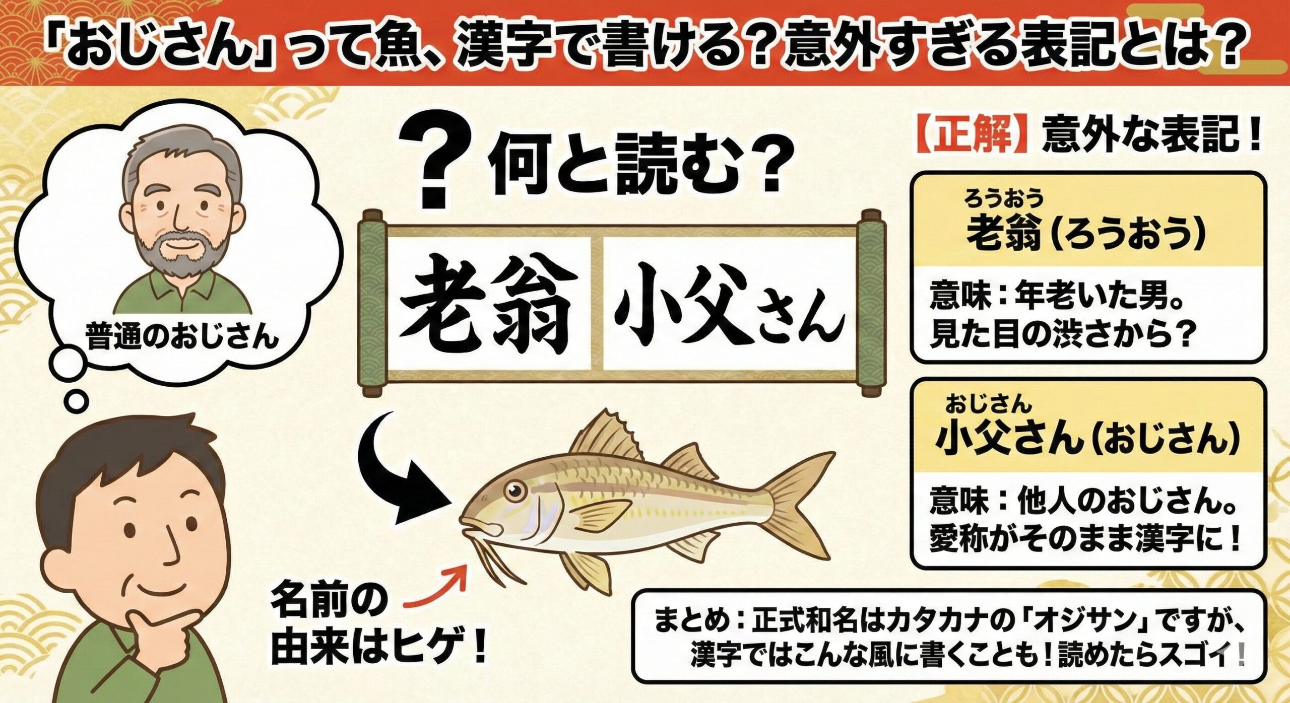 魚には難しい漢字が付いているイメージもありますが、実はすべての魚に漢字名が定着しているわけではありません。ここでは、なぜおじさんが文字表記で漢字にならなかったのか、その背景を見ていきます。