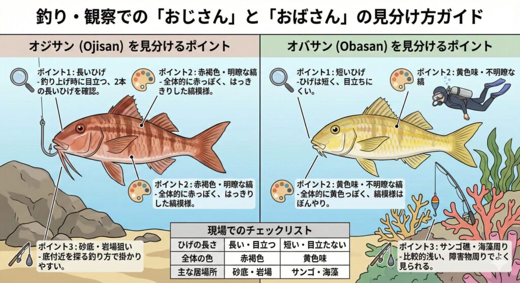 釣りや観察でおじさんとおばさんを見分けるには、以下のポイントに注目すると便利です。