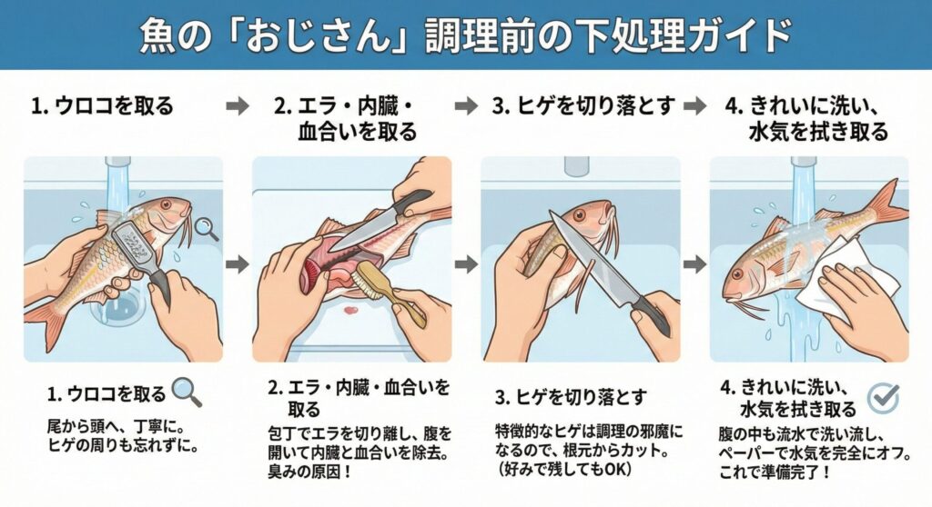 おじさんの魚はクセが少なく調理しやすい魚ですが、美味しく食べるためには下処理がとても重要です。下処理を丁寧に行うことで、生臭さを防ぎ、身の旨味をしっかり引き出すことができます。