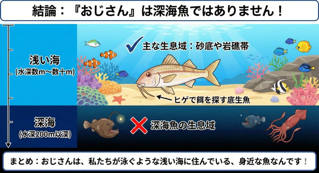 ここでは、おじさんがどんな海域に多く生息しているのか、そして底魚としてどのような生活をしているのかを解説します。